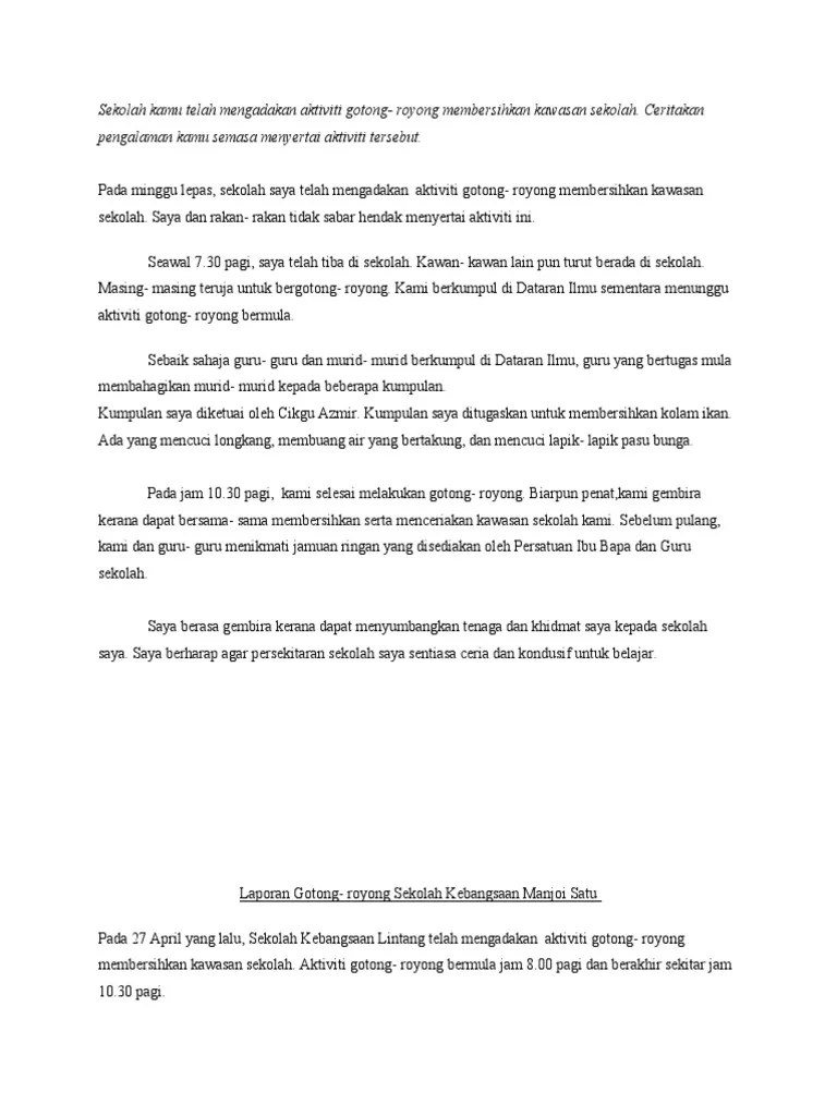 Contoh Karangan Pendek Gotong Royong Membersihkan Sungai / Ejercicio De Gotong Royong. Melawat penduduk kg lidah tanah yang bergotong royong . Diberikan kepada kumpulan 1 untuk ditanam. Beliau mengatakan bahawa tujuan aktiviti gotong royong ini diadakan adalah untuk membersihkan sekitar kawasan perumahan kami agar kami hidup dalam suasana yang .